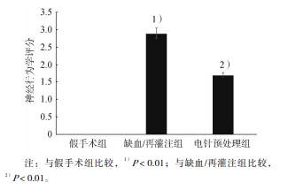 假手術(shù)組無(wú)神經(jīng)功能喪失;缺血/再灌注組神經(jīng) 行為學(xué)改變明顯,大鼠左前肢明顯不能充分伸展, 或向左環(huán)行運(yùn)動(dòng),出現(xiàn)輕度局灶神經(jīng)功能喪失,或 向左側(cè)倒,出現(xiàn)中度局灶神經(jīng)功能喪失;電針預(yù)處 理組神經(jīng)行為學(xué)癥狀較缺血/再灌注組明顯減輕。 缺血/再灌注組神經(jīng)行為學(xué)評(píng)分明顯高于假手術(shù)組 (P<0.01);缺血/再灌注組和電針預(yù)處理組神經(jīng) 行為學(xué)評(píng)分分別為 2.95±0.22 和 1.75±0.64,電針 預(yù)處理組明顯低于缺血/再灌注組(P<0.01)。見(jiàn) 圖 1。