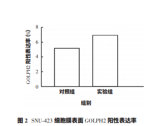 SNU-423 細(xì)胞膜表面的 GOLPH2 抗原相對表達(dá)量 [實驗組(6. 96%)與對照組(5. 73%)的差值]為 1. 23%。與對照組相比,實驗組細(xì)胞膜表面 GOLPH2 陽性表達(dá)率差異無統(tǒng)計學(xué)意義(F = 6. 91,P > 0. 05)。 見圖 1 和圖 2。