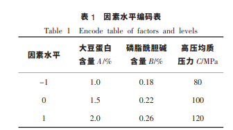 乳化制備工藝響應(yīng)面優(yōu)化 以大豆蛋白-磷脂酰 膽堿納米乳液的平均粒徑、PDI 及乳化產(chǎn)率為考 察指標(biāo),通過單因素試驗(yàn)考察大豆蛋白含量、磷脂 酰膽堿含量、 高壓均質(zhì)壓力及均質(zhì)次數(shù)對 3 個(gè)指 標(biāo)的影響規(guī)律。 進(jìn)一步利用 Design-Expert 軟件對 試驗(yàn)進(jìn)行響應(yīng)面分析設(shè)計(jì)優(yōu)化試驗(yàn)結(jié)果, 選取大 豆蛋白含量 A(%)、磷脂酰膽堿含量 B(%)、高壓 均質(zhì)壓力 C(MPa)及均質(zhì)次數(shù) D(次)4 個(gè)因素為 自變量, 以粒徑 R1 (nm)、PDI R2 及乳化產(chǎn)率 R3 (%)為響應(yīng)值,設(shè)置三因素三水平進(jìn)行試驗(yàn),如表 1 所示。