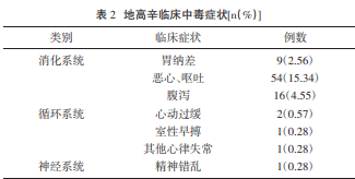 本次研究結(jié)果由表 2 可知, 發(fā)生地高辛中毒癥狀以消化道癥狀為主,共有 79 例(22.45%)。臨 床上該癥狀易與消化系統(tǒng)疾病混淆,延誤治療時(shí)機(jī),臨床藥師應(yīng) 對以上兩種情況加以區(qū)分,給醫(yī)生提供有效建議。