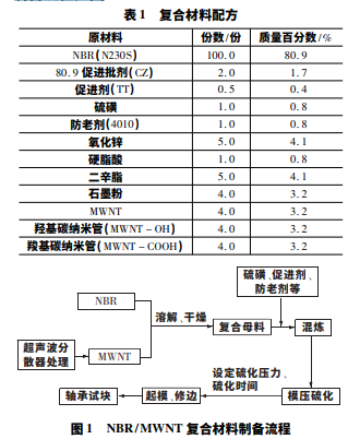 碳納米管 (MWNT) 在具有極大的長徑比的同 時具有超高的強度和模量,是一種特殊的一維材 料,是復合材料的理想添加劑。橡膠是一種非 金屬聚合物,其彈性性能好、吸振能力強、在受力 的情形下產生變形,撤消力后能夠立即恢復原形, 抗沖擊性能好。但橡膠作為水潤滑軸承存在一些顯 著的缺點,例如在高溫、高負荷下性能較差,運行 精度低等,通常使用的碳納米管和橡膠共混方 法包括機械共混法、噴霧干燥法、膠乳共混法、溶 液共混法。這些方法中機械共混法效率高,時間短,但在混煉的過程中 MWNT 易與橡膠基體產 生團聚,制得復合材料效果并不理想; 噴霧干燥法 制備過程復雜不易操作; 膠乳共混法雖能在一定程 度上改善 MWNT 在膠乳中的分散問題,但并不能 改變 MWNT 在膠乳中的團聚; 溶液共混法可以通 過超聲波的作用打斷 MWNT 的結構,減小團聚的 發(fā)生,便于 MWNT 在橡膠基體中均勻分散,但在 制備過程中會用到多種有機溶劑,如果處理不當容 易造成污染。